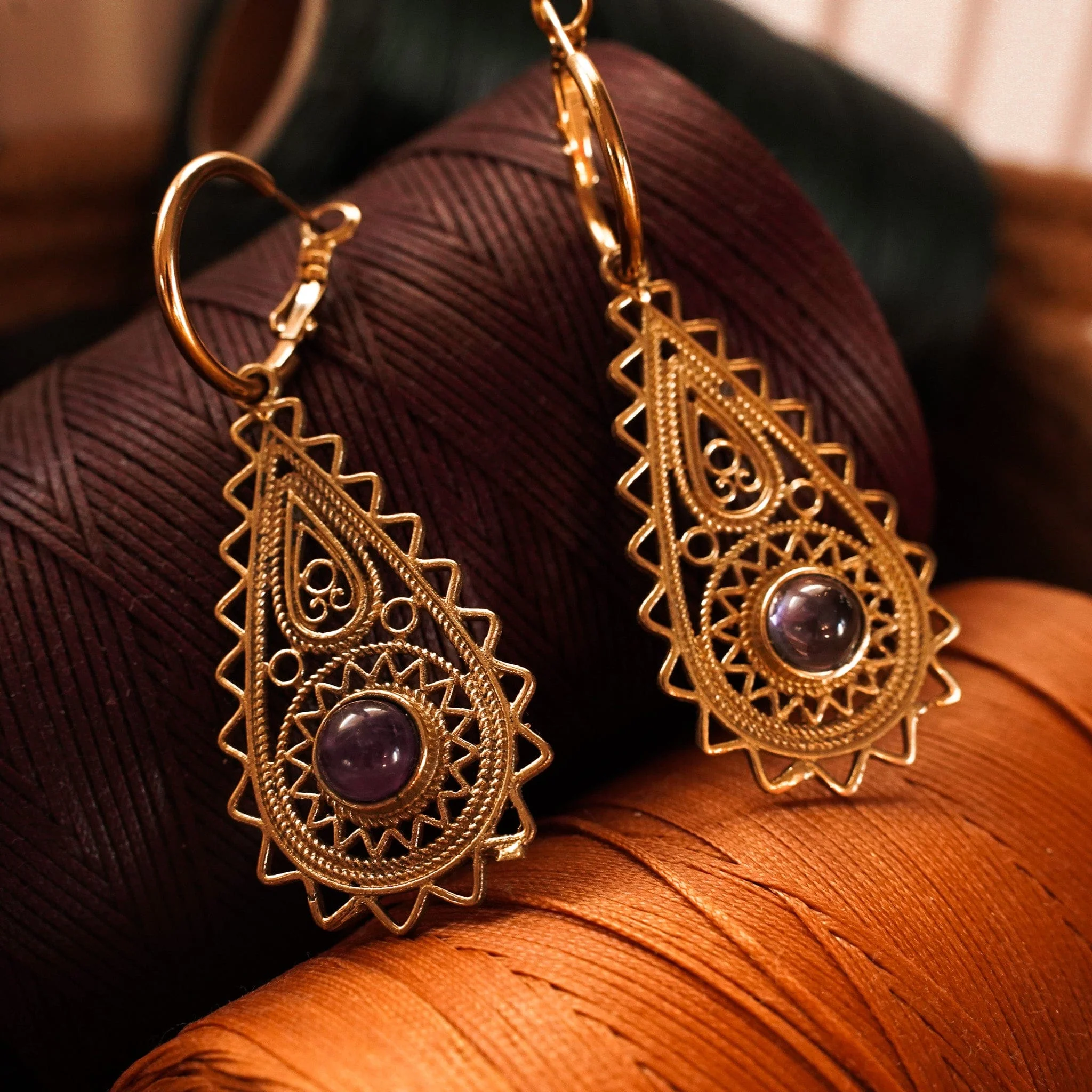 Drop of Dusk glows like the last light of day, warm and mysterious.A detailed golden pendant flows from a stainless steel hoop, light and effortless to wear.At its heart, natural amethyst shimmers with quiet magic and depth.Boho, hypnotic, and hypoallergenic—made to move with you from dusk to night. ✨💜
