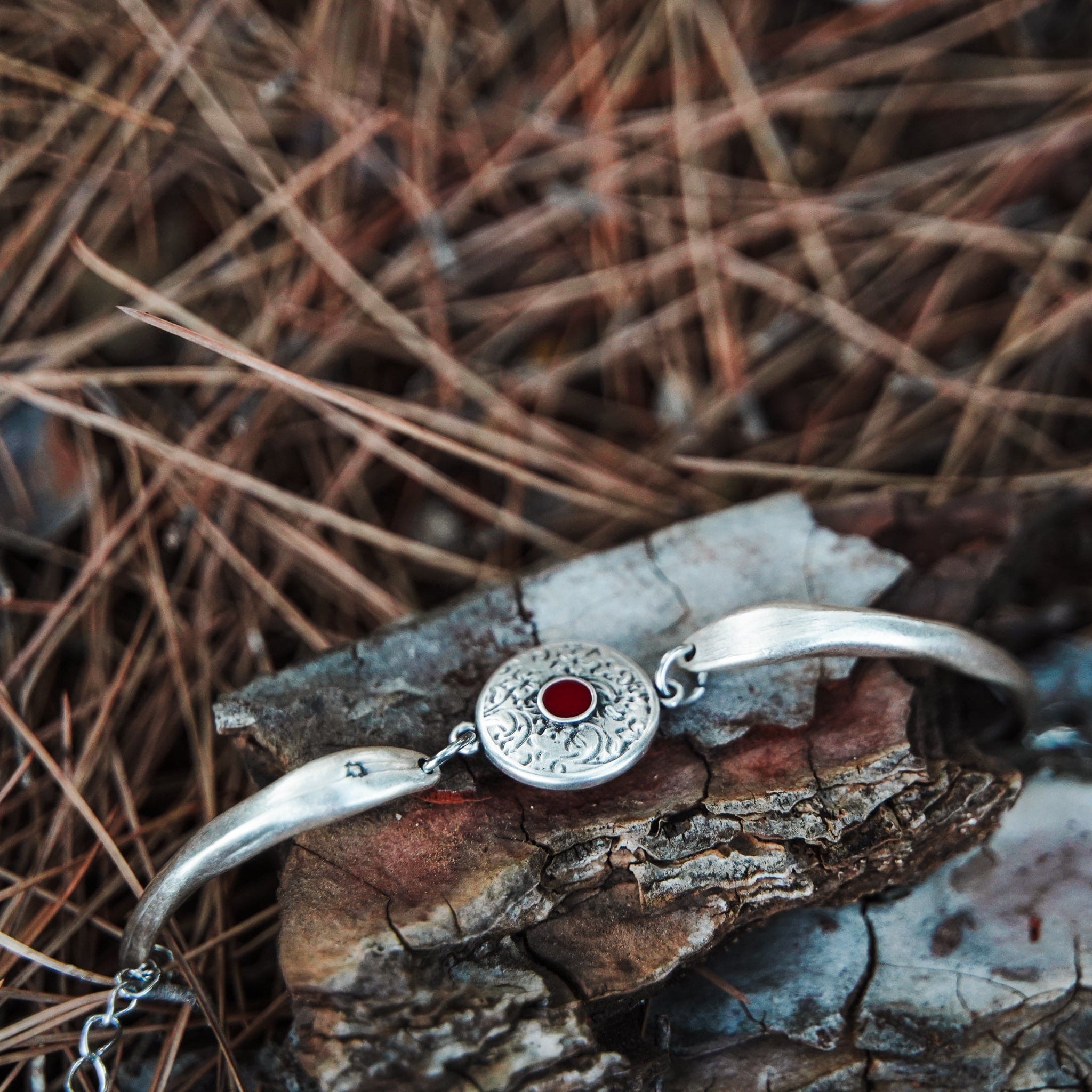 Are you a vintage lover? Then our “Fuego Bracelet” is the best choice. It is crafted with 2 bands and a small, hammered pendant with red enamel. Don’t miss it!