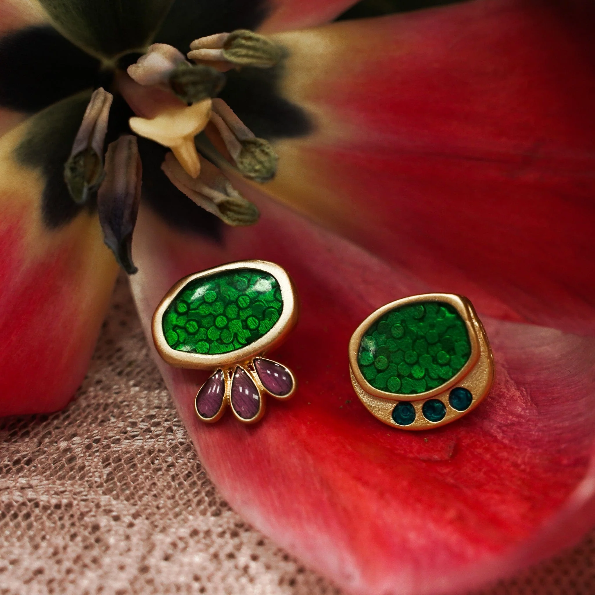 Step into a blooming garden with "Lily," the stud earrings that bring the joy of spring to your style. Crafted in glowing gold with vibrant color details, each earring evokes a lush spring garden. Perfect for adding a floral touch to any outfit, Lily earrings let you wear the essence of springtime flowers right on your ears, brightening any occasion with their playful charm.