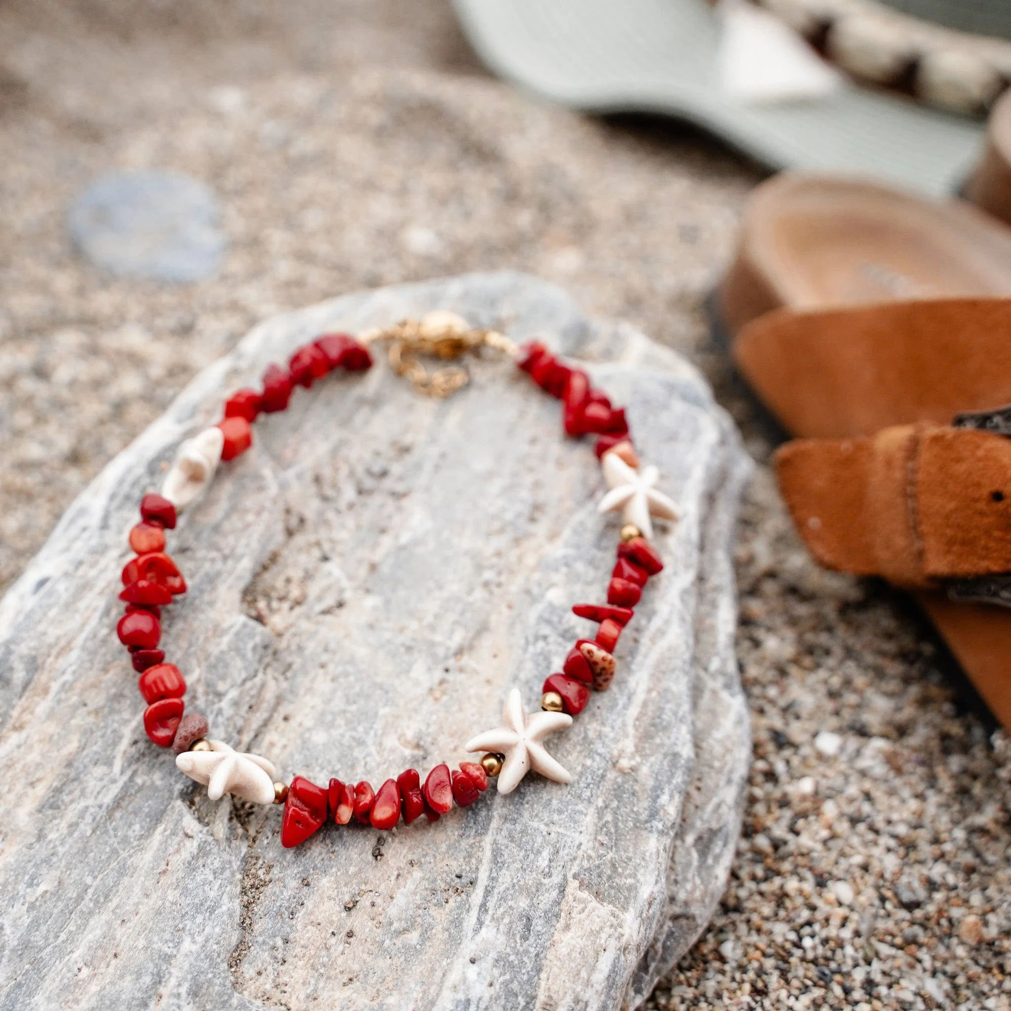 Let your steps tell a seaside story with our “Starfish Steps” anklet. Crafted with guitar wire and natural coral beads, this piece features delicate starfish charms that instantly evoke the scent and soul of summer. Lightweight, playful, and full of ocean vibes, it’s made to follow you from shorelines to sunsets. A true tribute to barefoot days and salty air.